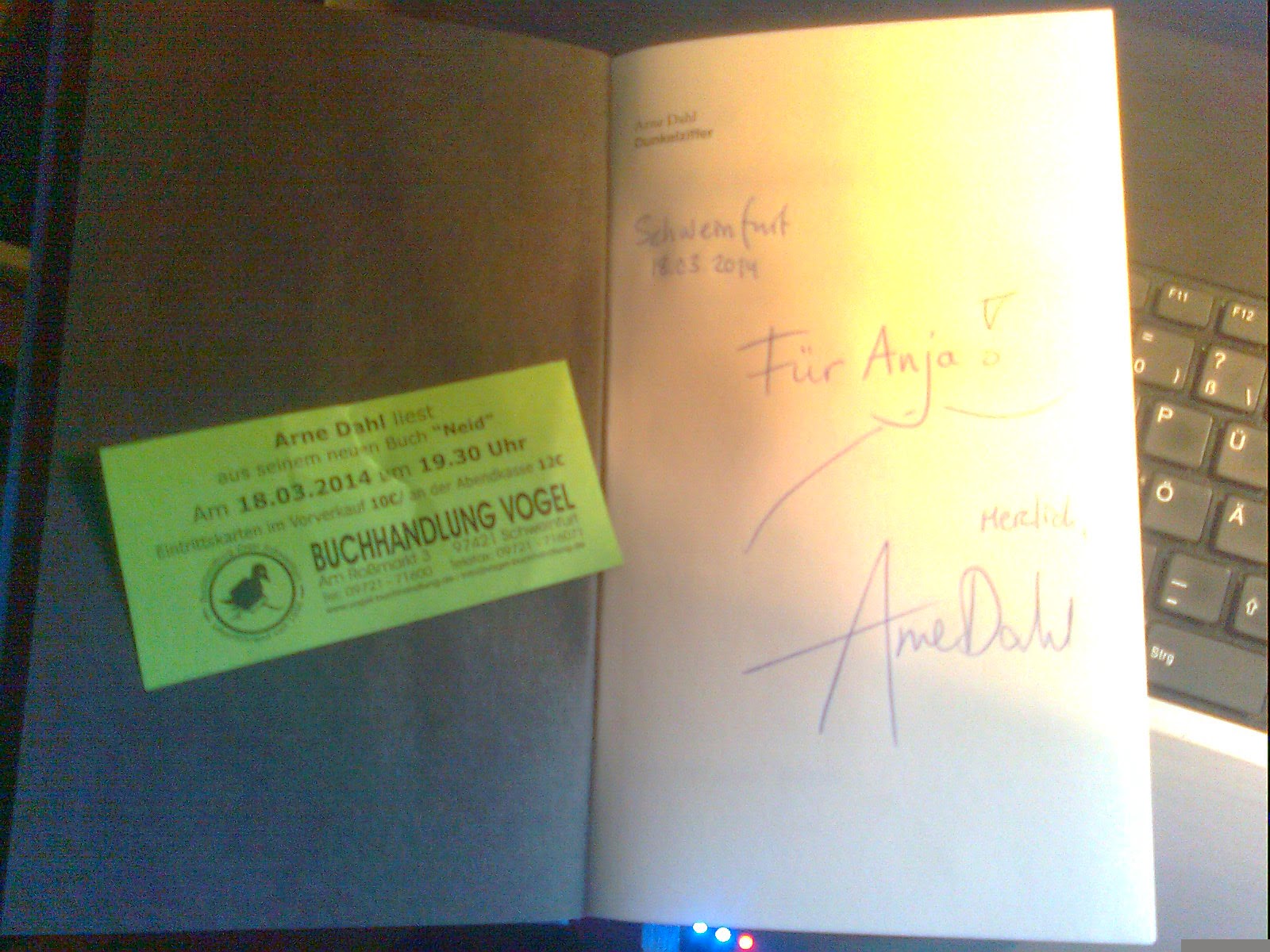 Heute ist es soweit. Heute Abend gehe ich zur Lesung mit Arne Dahl. Mal sehen, ob ich auch ein Foto machen darf von und mit ihm. Ich freue mich schon so.